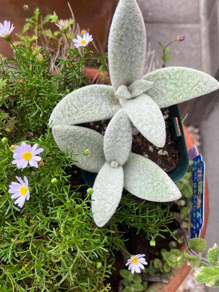 さんこんにちは♪肉厚の葉っぱの表面に産毛があって見た目ふわふわ、触ると〜毛足の短〜いベルベッド的な感じかな!?硬くもなく柔らかくもなく中間位な感じ☘️これでは伝わらないですね😆😆