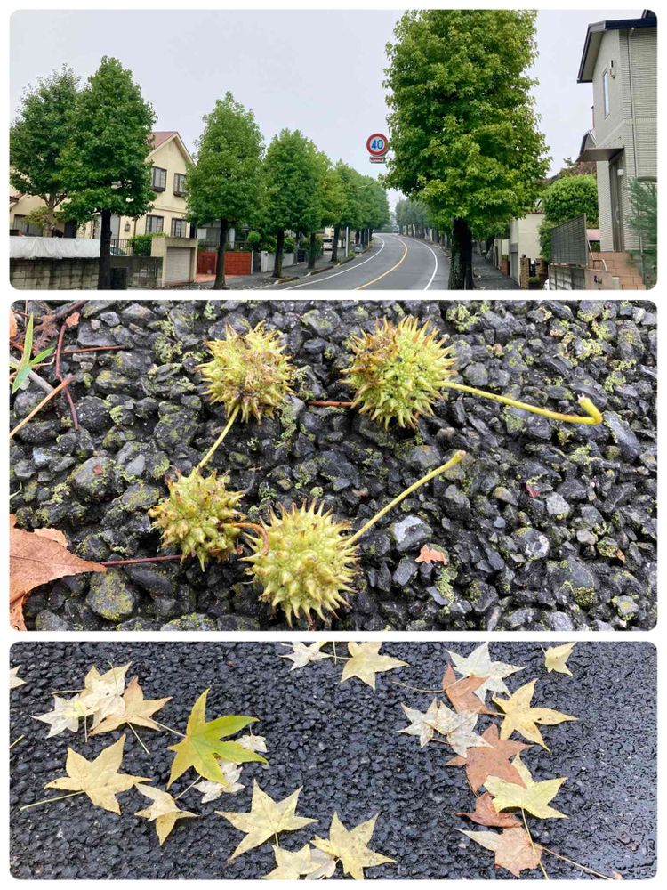 先週の強風雨でアメリカフウ(モミジバフウ)のイガイガの実と🍁葉が歩道に散っていた。