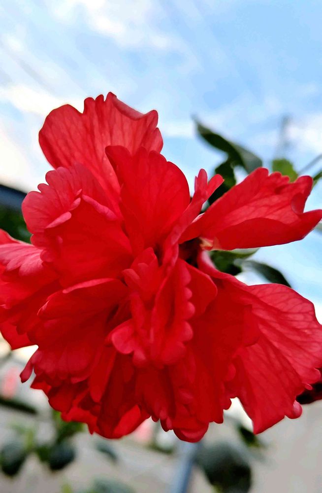 真っ赤な八重咲きハイビスカスの花が咲いていました😀