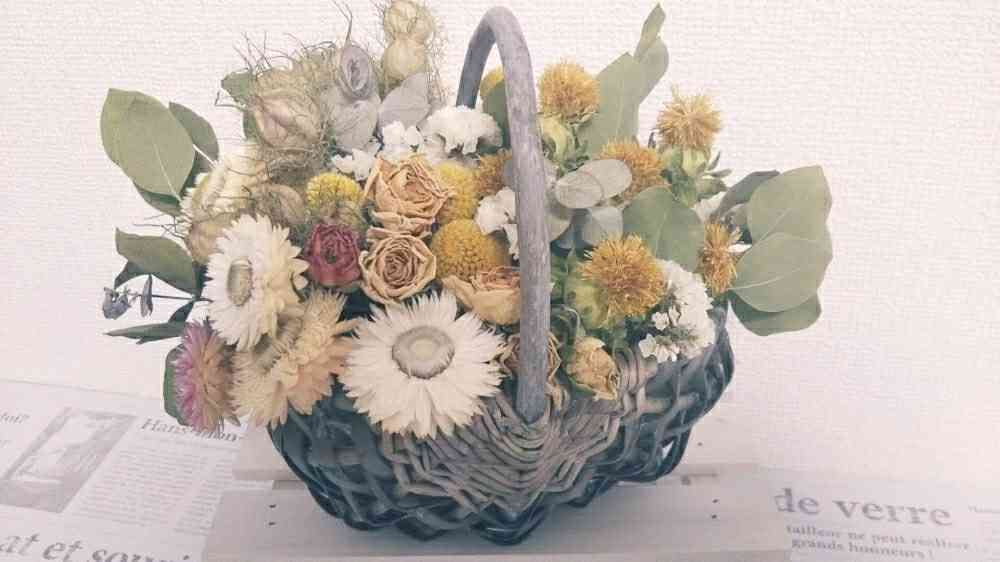 レモンイエローの紅花のドライフラワーができたので、かごアレンジを作ってみました♡*。