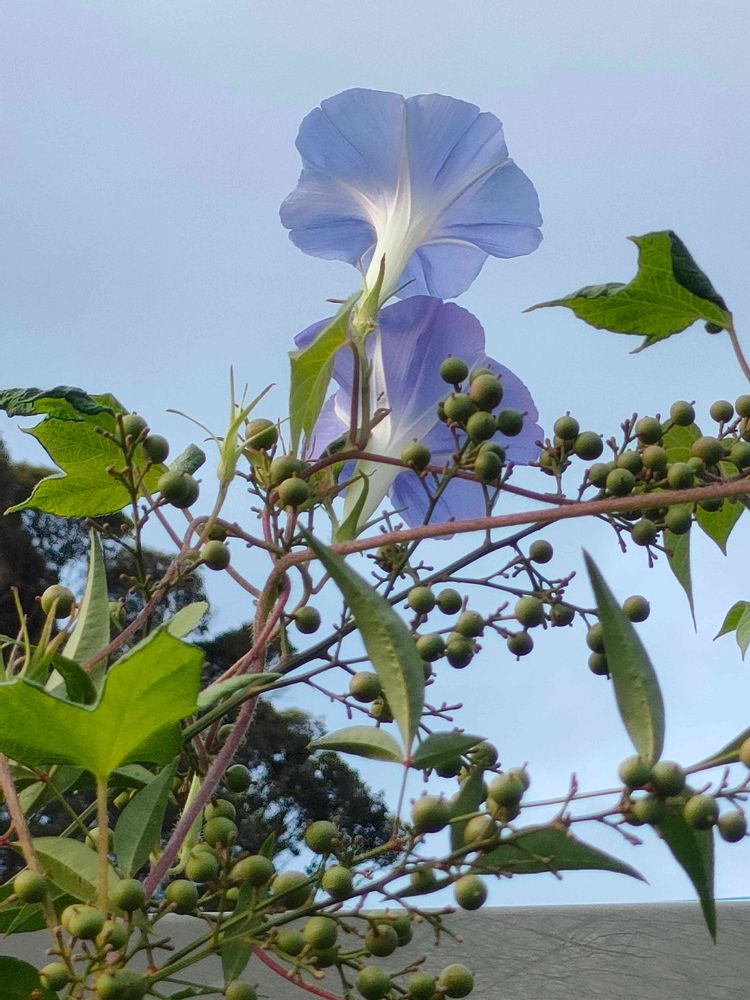 庭のどこでも咲いてるあさがおのお花今日は南天の実の所に咲いてます☺️