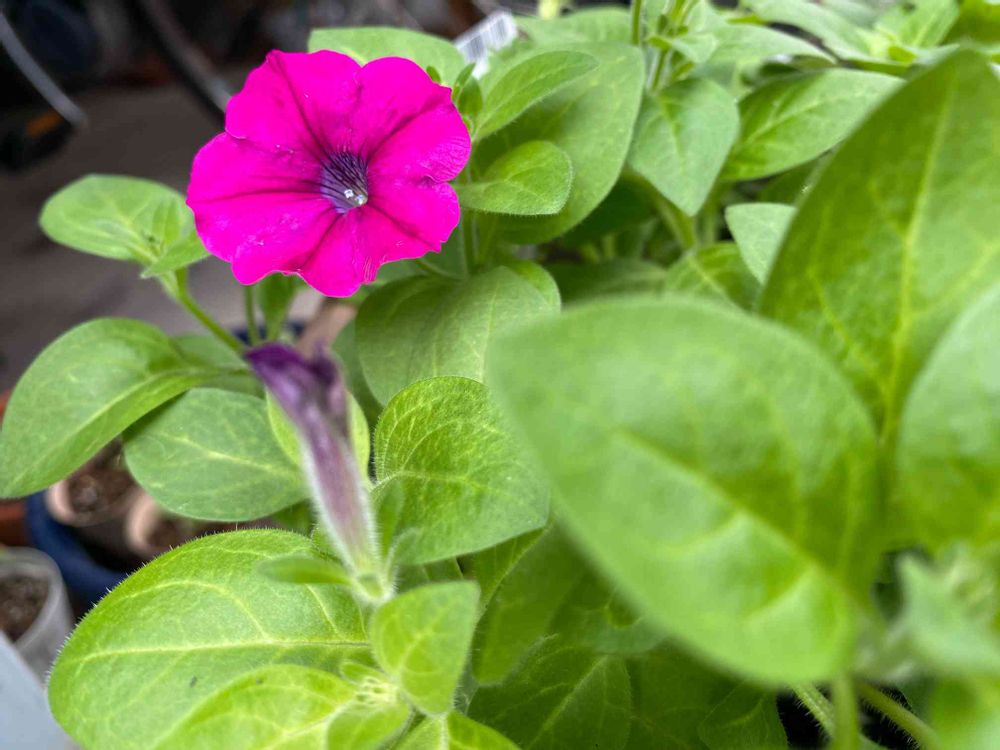 挿し芽のサントリーサフィニアパープルミニが一つ咲いた。暑すぎたので、これから元気に咲いてくれたら嬉しいなぁ☺️