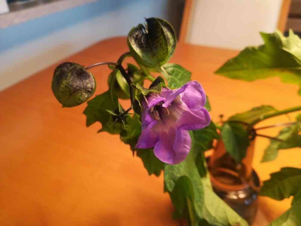 花が咲く前は、ホオズキのように袋のようになっていて、紫の花が咲きます。