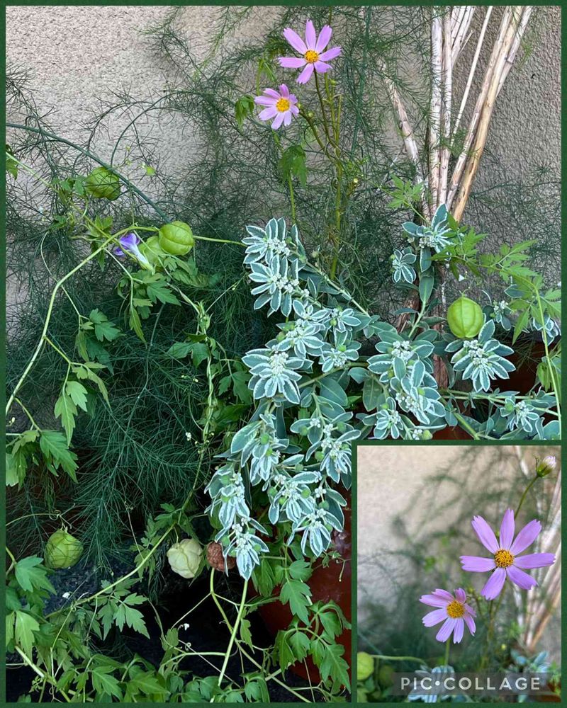 ハツユキソウ、アスパラガス、フーセンカズラ、コスモス