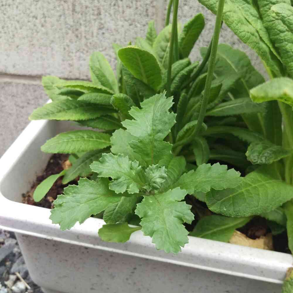 プリムラ・ビアリーのプランターから、明らかに違う形の葉っぱか一本だけヒョロリと伸びて成長しています。