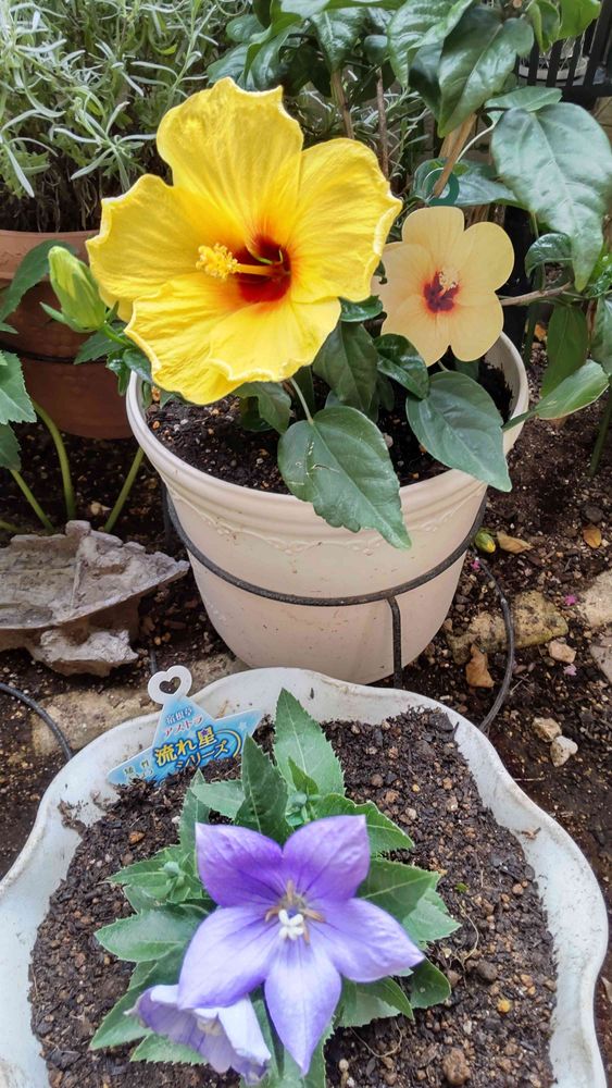 今朝、奥の黄色ハイビスカスが咲いたので、一緒にパチリ📷️