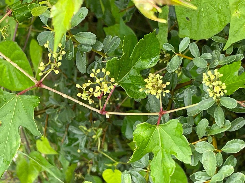 拡大して見ると、左から二つめと右端の花序に、開花した花が見えます💠