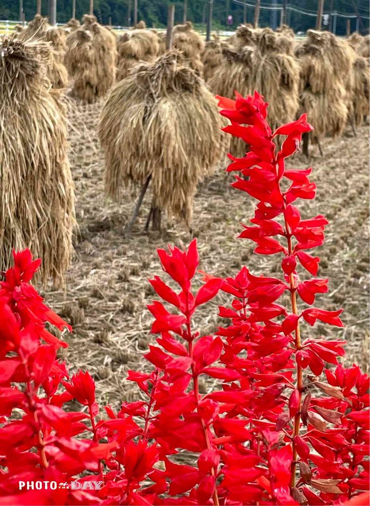 真っ赤なサルビア💕と刈り取られた田んぼとの風景がとても素敵💓。