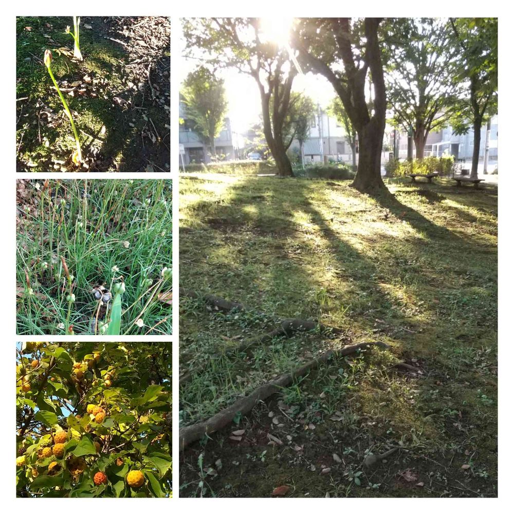 おはようございます🐦️🐕️散歩の公園の朝日の高度も斜めになってきて 柔らかい影でした…✨↖彼岸花がスウッと伸びてきています🌱 ← 6日前に満開だったハブランサス ツビスパツス(GS先輩に教えて頂きました☺️)が、もう 種を作っています✨👀早技!↙ヤマボウシの実🟡🟠🔴食べたことありますか…?美味しいのかな?