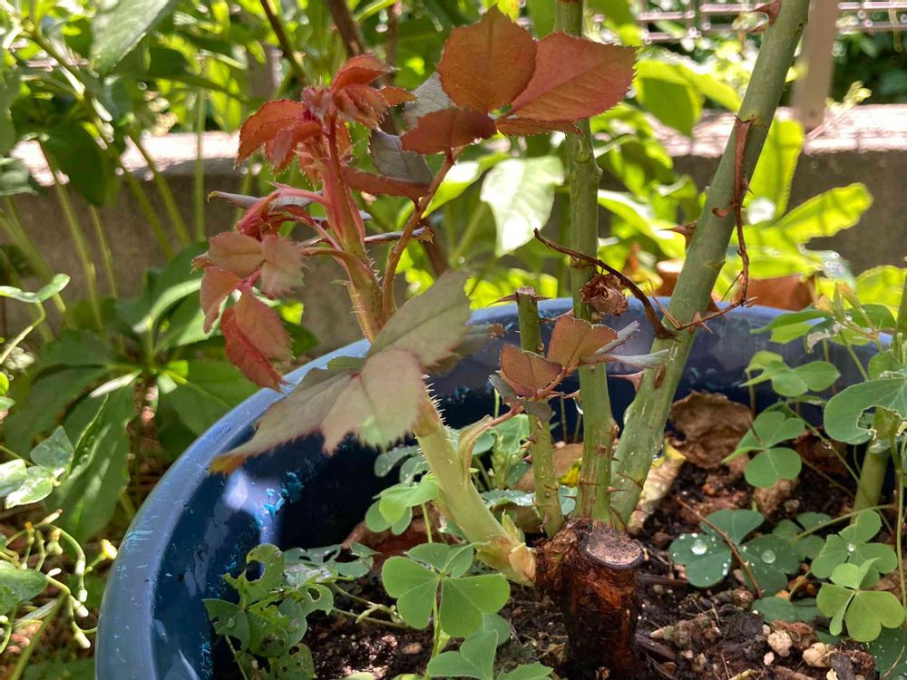 新芽を摘んでいけばまだまだ良いシュートが出る、とのことで私なりに摘蕾やピンチを続けていましたが、元気なベーサルシュートが現れました!👶