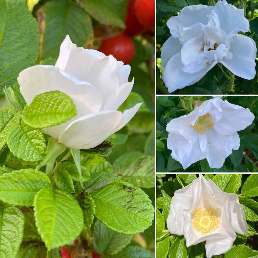 ハマナスの赤い実がびっしりの所に、白い花が咲いていてビックリ🫢