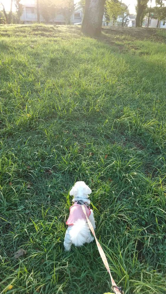 いつもの散歩コース公園の『朝露ヶ原』(勝手に名付けました😁)で ルンルンの後ろ耳の🐕️笑