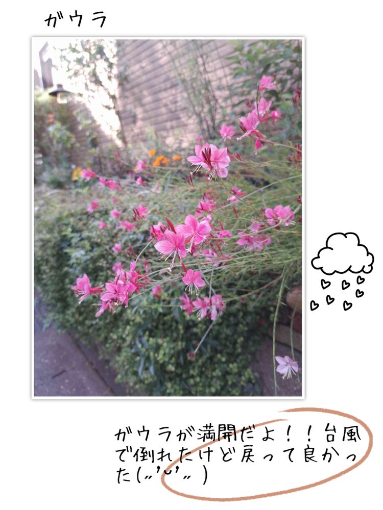 先日の台風で、根元から倒れていたガウラが起き上がり満開の状態で咲いてます🌸