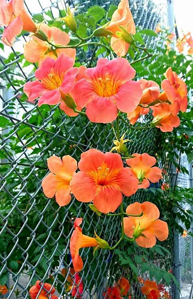 ☆歌詞では赤い花と歌っているので濃いオレンジのノウゼンカズラかな?これより細いラッパ型の花もありますね。