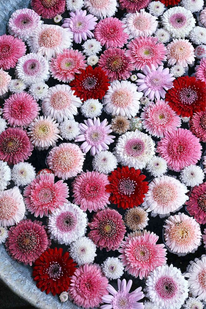 うぁ〜、八重咲きのガーベラが、白、ピンクに赤と色とりどりの花手水ですね( ´ ▽ ` )
