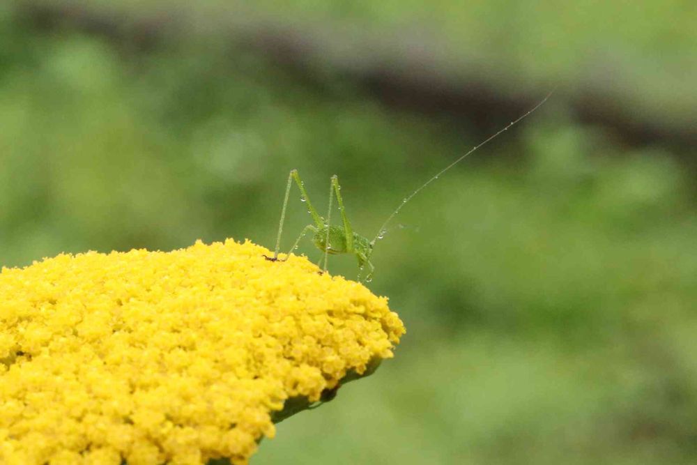 ツユムシでしょうか?花に踏ん張ってました。花の名前がわかりません。ご存知の方教えてください🙏