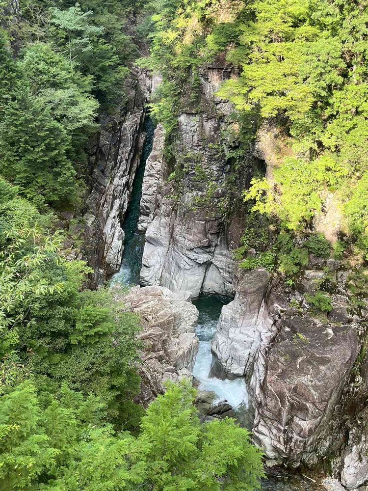 大人のリハビリ遠足、鮎のヤナからのモネの池そして川浦渓谷も行きました。まるでポツンと一軒家のような道なき道とまでは言いませんがすれ違う車一台もなく、本当に大丈夫?と義両親が心配するなか、主人がどんどん車を進めていきます。落石注意の看板の先に通行止めの文字も💦もう引き返す?と言おうとしたらようやく川浦渓谷な看板が。車で進める最奥地にある渓谷でした。何があっても自己責任。切り立った岩壁の間を直角に折れ曲がるように川が流れる様子は、まさに渓谷らしい絶景でした。落石の形跡があり、今ここで落石あればどうする?とヒヤヒヤしながらの自然の怖さと美しさを感じました。