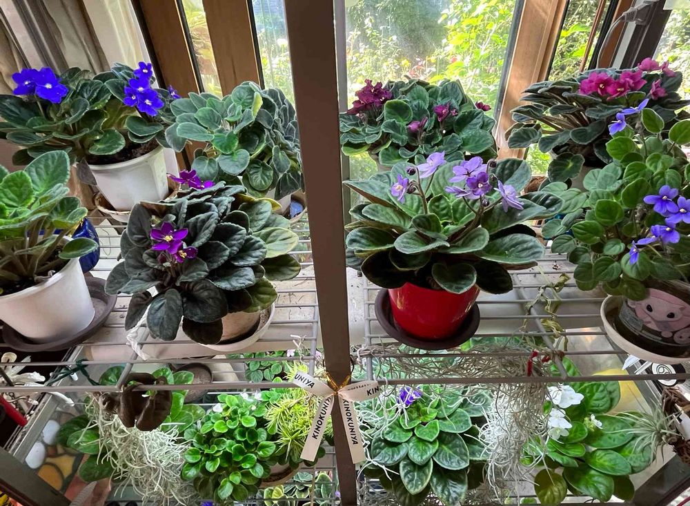 セントポーリアさんたちが湿度も温度も心地よく整えられたお部屋で幸せそう💕