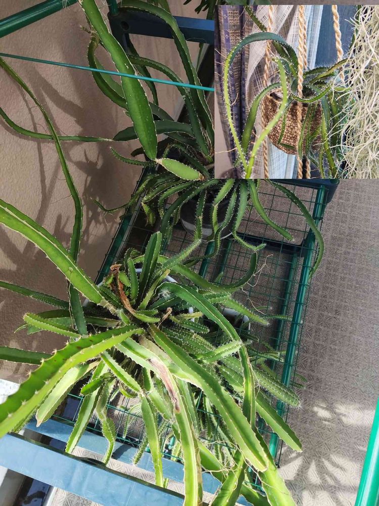 おはようございます!食べて残った種から育てているドラゴンフルーツです。右上の写真はおなじ種から育てた私の部屋にあるドラゴンフルーツです。土が違うだけでこんなに差が出ています。外のやつは一本だけめっちゃ太くて1m以上伸びてるのがあったりでめちゃくちゃです。😆