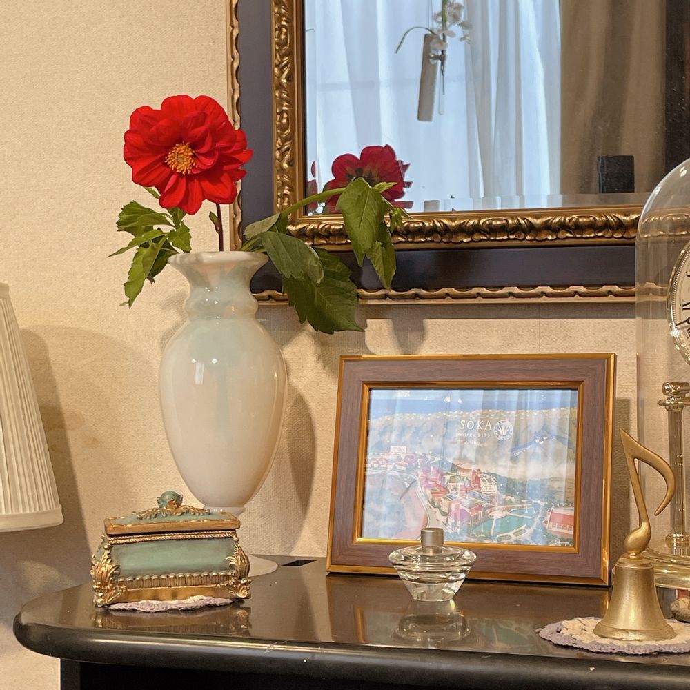 インテリア仏壇「鏡壇ミラリエ」「鏡壇ミロワ」に今日(9/15)の誕生花の「赤いダリア(天竺牡丹)」 を飾ってみました。