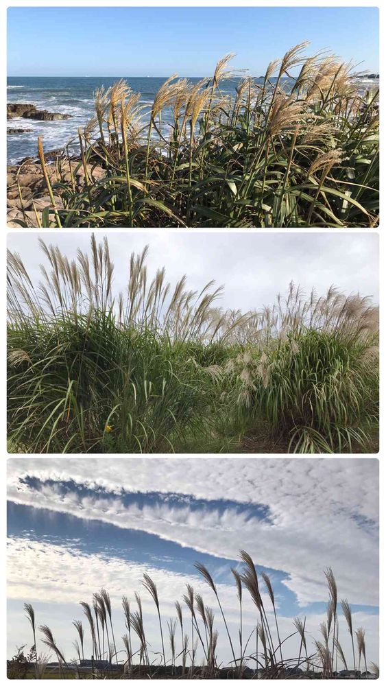 上段、千葉の海岸です。海無し県育ちなもので海辺を歩くだけでテンションが上がります。海にススキって斬新だなぁと撮影していたら、散歩の老夫婦が不思議そうに通り過ぎて行きました。