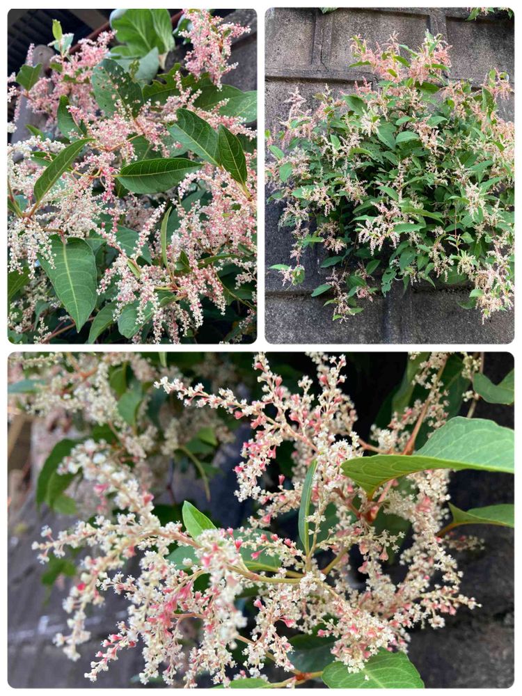 コンクリートの法面から「イタドリ」が生えて花が咲いていた。