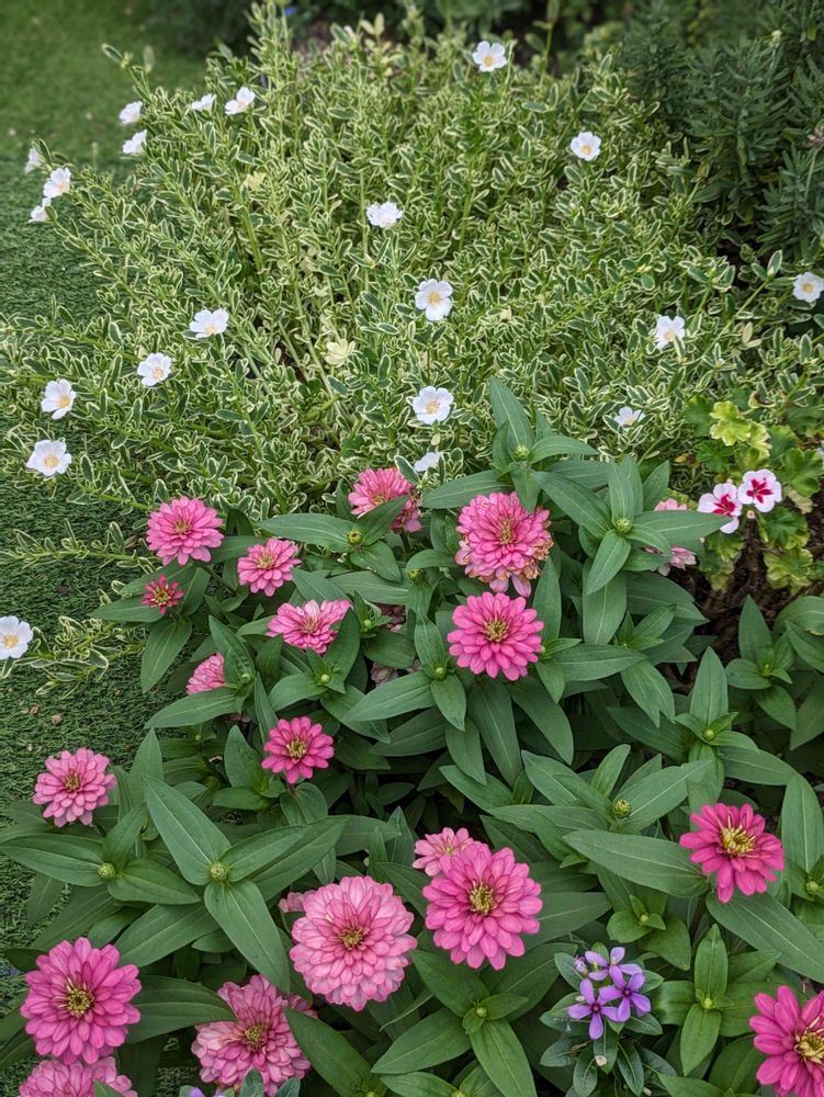 ジニアが本当華やかで綺麗🩷ザハラダブル素敵😍種売ってるかしら🤔斑入りのポーチュラカが良い味出してますね🤍