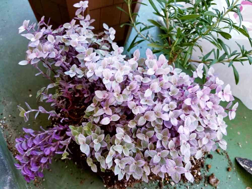 ローズマリーの根元にポイッしてた桃色カリシア、ワサワサになってきたので植え替えしました🌼