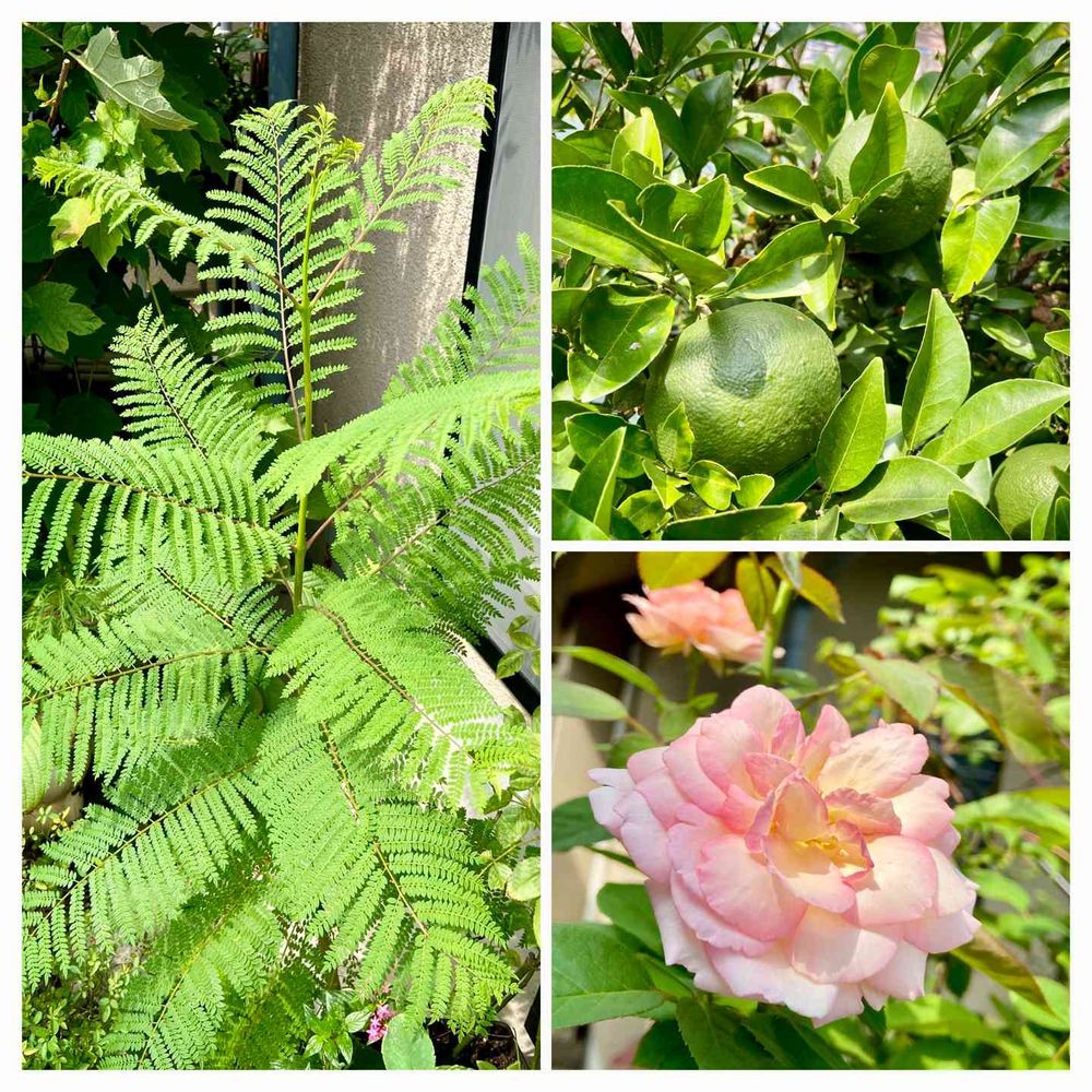 ☀️32℃まだ夏庭の今日💦🌱春に植えたジャカランダは葉っぱ盛々だけど💜花は遠い先ですね😅🌹薔薇も夏顔💦🍊夏みかんは今年は10個位かな🎵💕