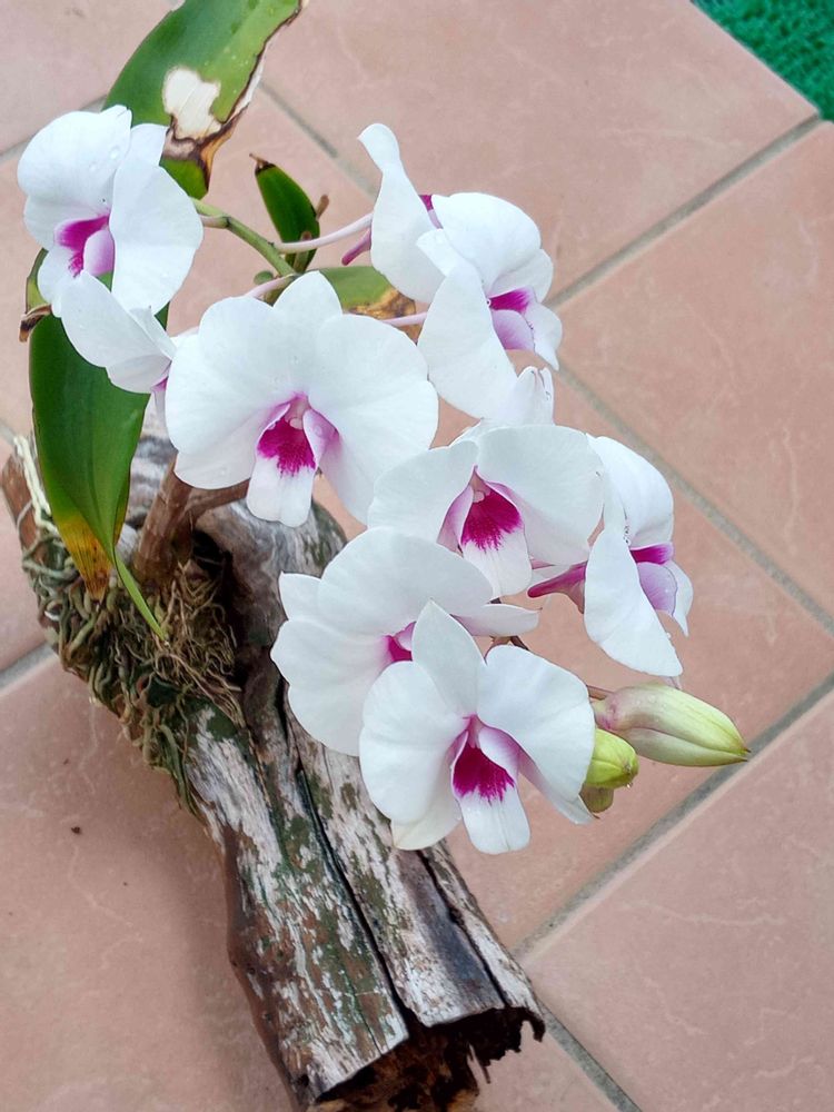 ウッドデッキの手すりの流木が朽ちて来たので今年5月に全部取っ払ってDIY🔨、その流木に着床してた蘭💮が今ほぼ満開です!😍