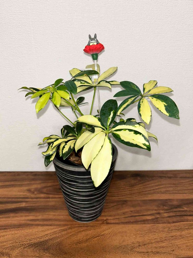 カーネーションに乗ったトトロのピック!新しく仲間入りしたホンコンカポック(シェフレラ)に飾りました(^^)