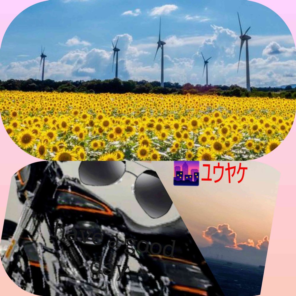 背の高い風力発電のタワーと広々としたヒマワリ畑は雄大ですね🤗