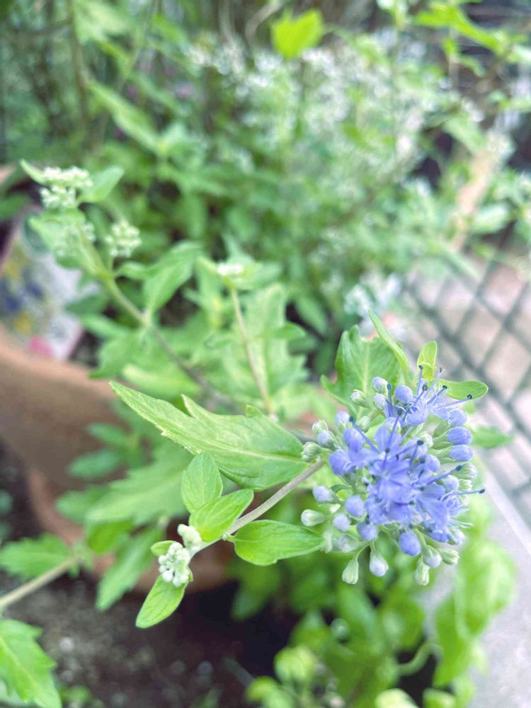先日 一つの鉢に詰め込んだ カリオプテリスのお花が咲き出しました。