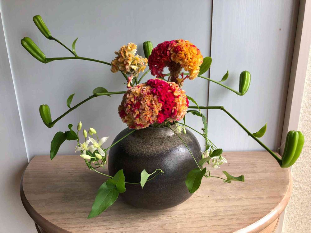 種の形ががキース・ヘリングの絵のみたいで面白い鹿の子百合に2色混ぜが楽しい鶏頭、咲き始めた仙人草を合わせて生けました。