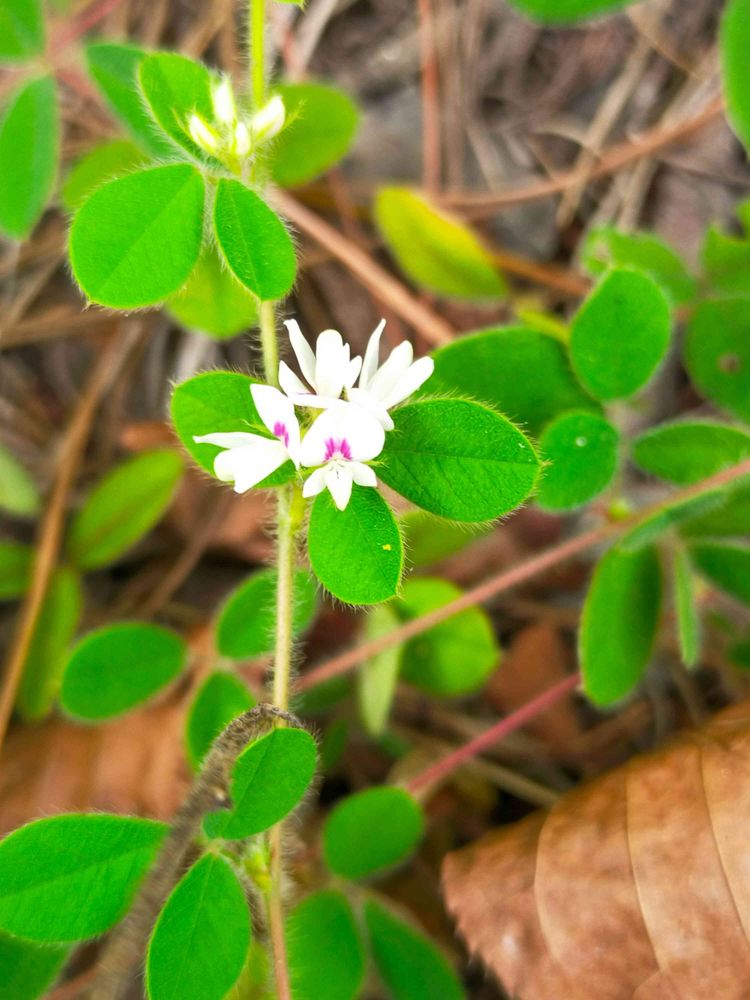 ネコハギ(猫萩)。マメ科ハギ属の多年草。全国の日当たりの良い草地に生えます。葉は互生で三出複葉、茎は地面を這うように伸び、白に紫の斑紋を持つ花を咲かせます。全体に軟らかな毛を持ち、手触りが猫に似るとも云われています。