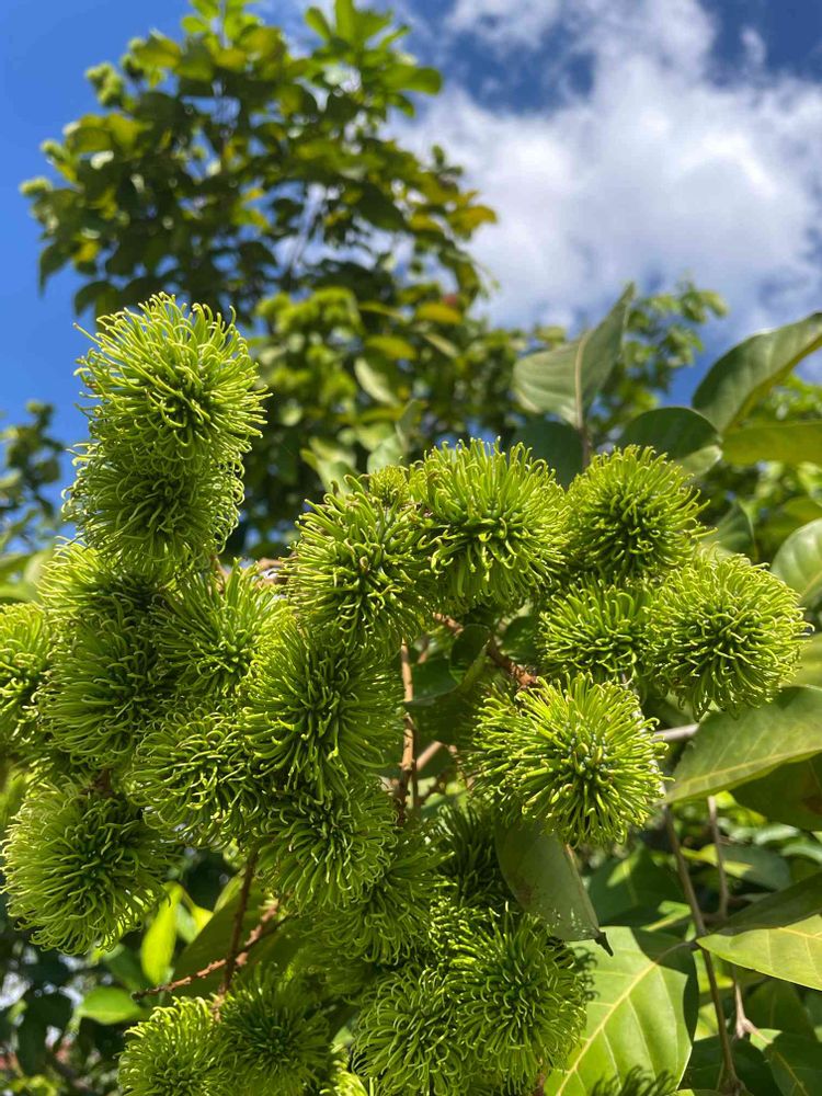 いつも赤いのをもらうので、青い状態で木になってるのを初めて見ました。ランブータンじゃないみたいですがチクチクの先の曲がり具合いは確かにランブータンですね。😆💚