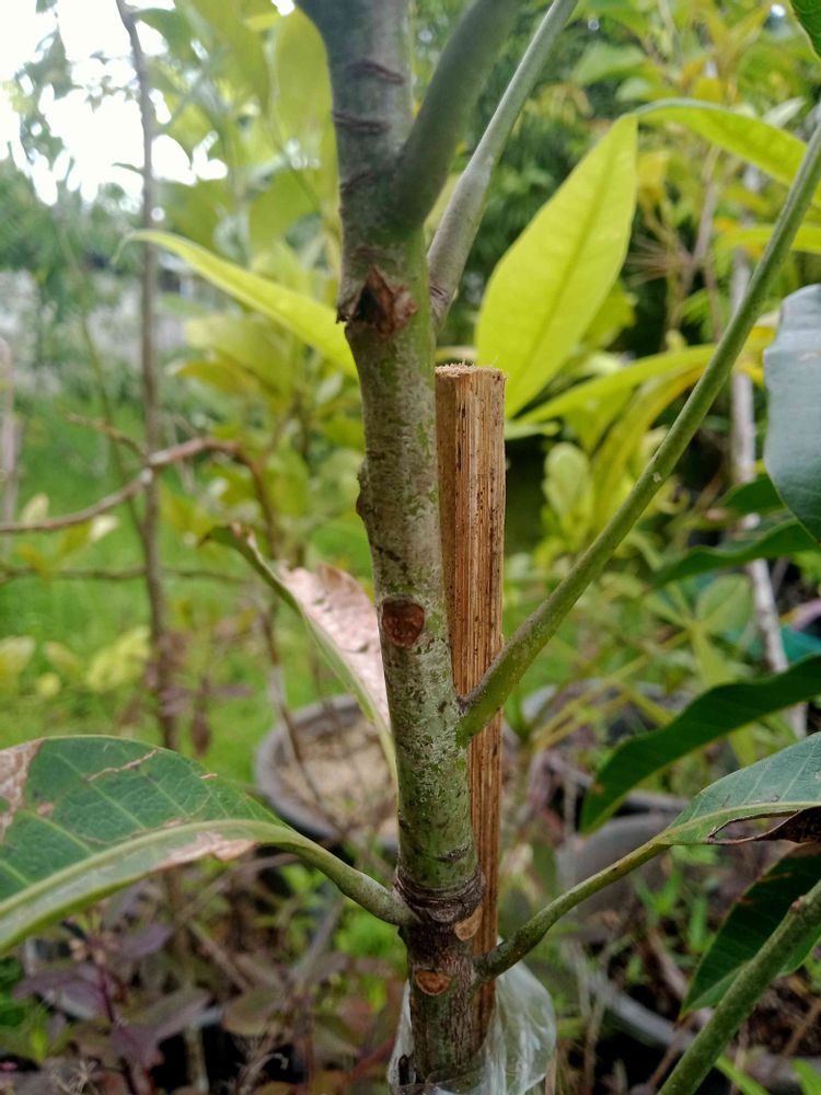先日当方に小ぶりの箱にやや折り曲げて届けられた、例のアイスクリーム🍨味のマンゴー🥭マンクンシー種、主幹の亀裂が傷として残ってしまいました。