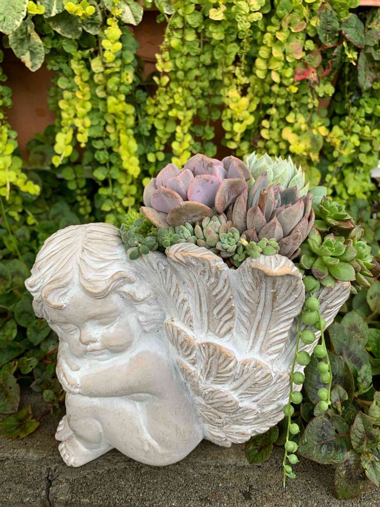 え〜!!!! エンジェルちゃんの鉢めっちゃかわいい〜はねの所に植える感じなんですね〜いいなぁ 僕も探してみよっと໒꒱⡱