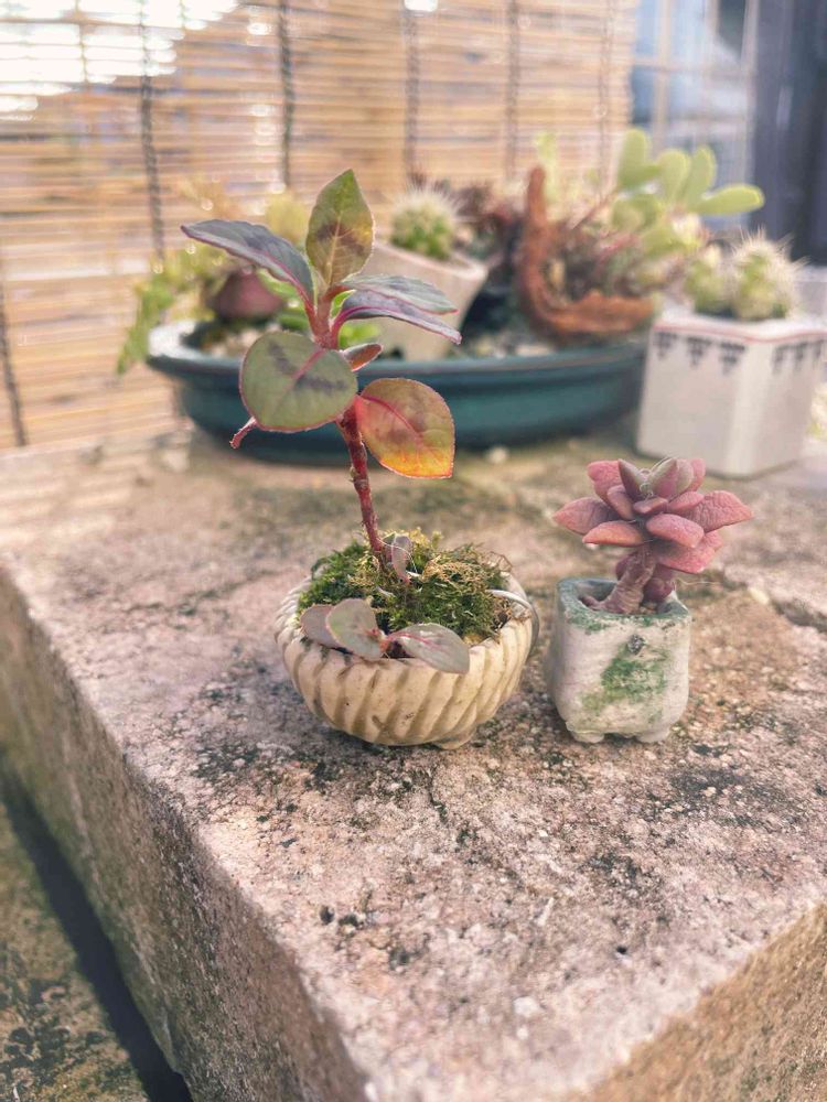 最近、山野草を始めました。旦那は盆栽、私は下草を学び始めました。 自宅で陶芸しています、豆鉢など作っています。の