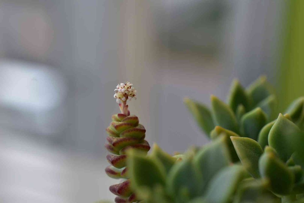 イモムシ多肉さんのお尻から、オトナのお目々には厳しいサイズのお花。