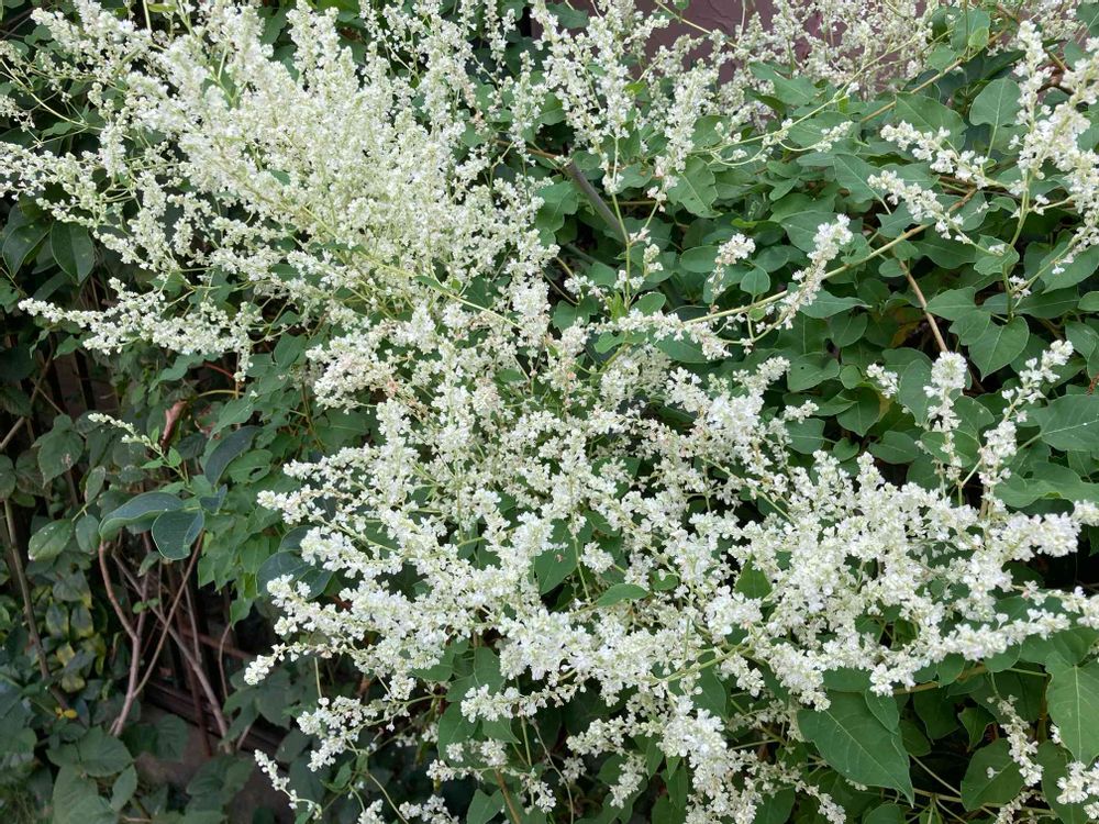 ナツユキカズラ。真っ白な小さな花をいっぱい咲かせる蔓植物。ハツユキカズラと名前だけは似ていますが、キョウチクトウ科とタデ科で種類は違います。蔓植物が大好きな花友さんの広いお庭で今満開に咲いています。
