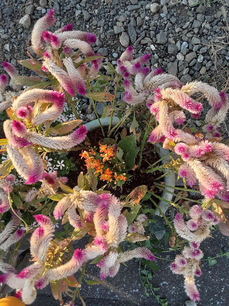 色が長持ちの、ケイトウが、良い感じに抜けてきて、すごい存在感だったので三鉢選んで、丸い鉢に寄せ植え。