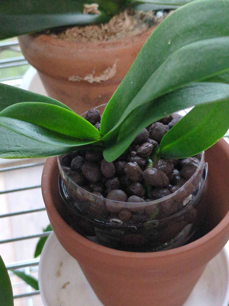 名無しのマイクロ胡蝶蘭のハイドロボール植え替えもしてみたよ🤓横にある葉っぱ1枚、2年前に脇芽?でたきりまるで変化なし😥これでなんらしかの変化は起きるだろうか🤔