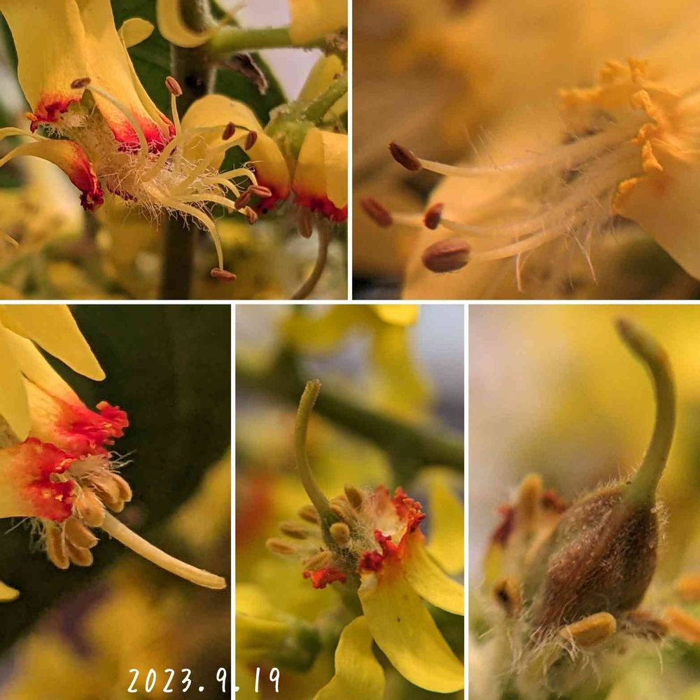 上段↖‥雄花が咲き進んで爪の様な付属体が赤く染まっています~間もなく‘’金色の雨‘’となって…そのままの姿で風に舞い、地上に落花します‥🍃💅💛