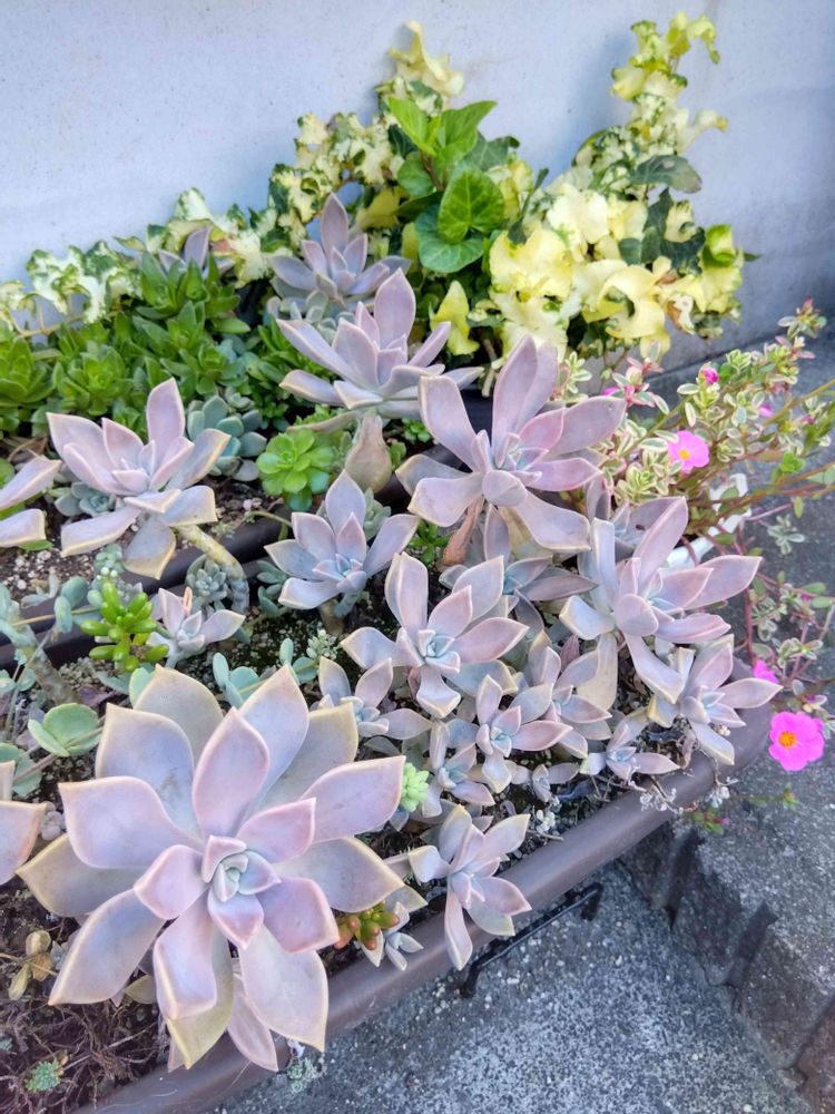 このおぼろ月たちは、庭で育ったものをプランターに挿したもので、寄せ植えとは思ったことがありませんでした。