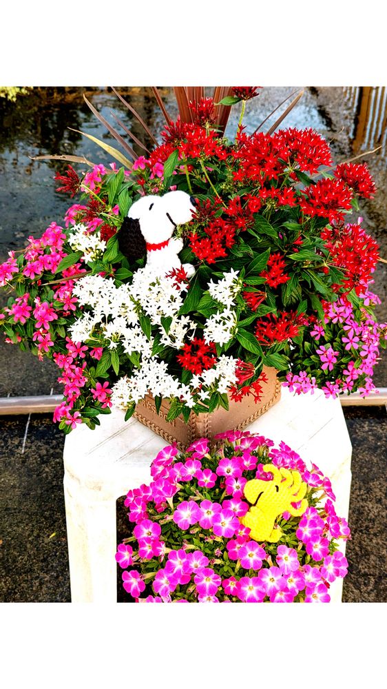 寄せ植え、赤やピンクが華やかですね〜🎶