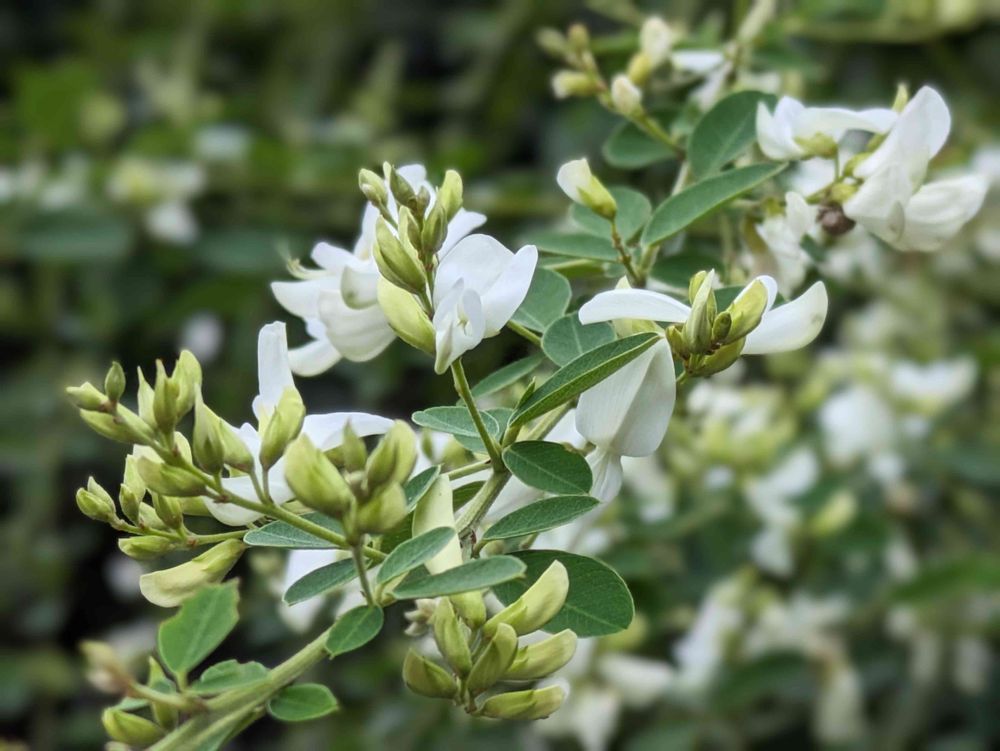 シロバナハギ🤍💚(マメ科🫛) 枝が長く垂れて白い花を咲かせている姿がとても見事です🥰 (お隣りさんの玄関横で📱)