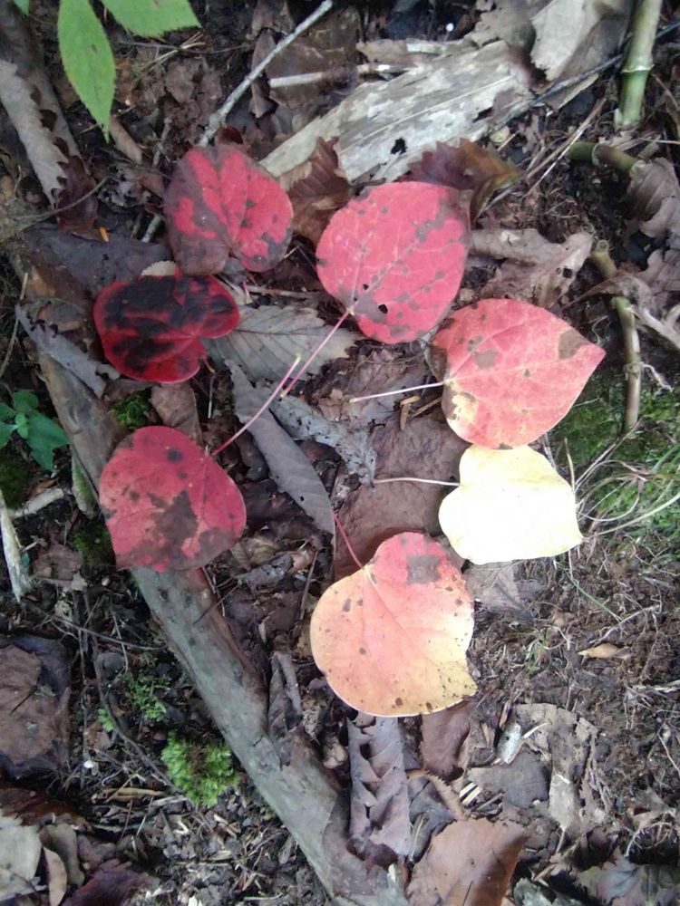 薄暗い植林地の登山道を歩いていたら、ほのかに甘いカルビ臭が。おやっ!どこかにカツラの木が?周りを見渡しても形の良く似た紅い落ち葉ばかり。黄色いカツラは見当たらず。コシアブラでもあったのかな?2…23.9.20 南沢山登山道