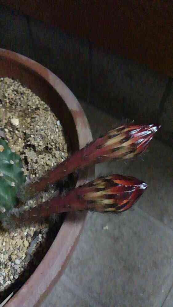 で、こっちが明日の夜に咲きそうなロビプシです。初めて蕾を見るのですが、これは赤系が咲きそうです。ロビプシ(ロビビア×エキノプシス)は咲くまで何色が出るのか分からないから面白い( ´∀`)