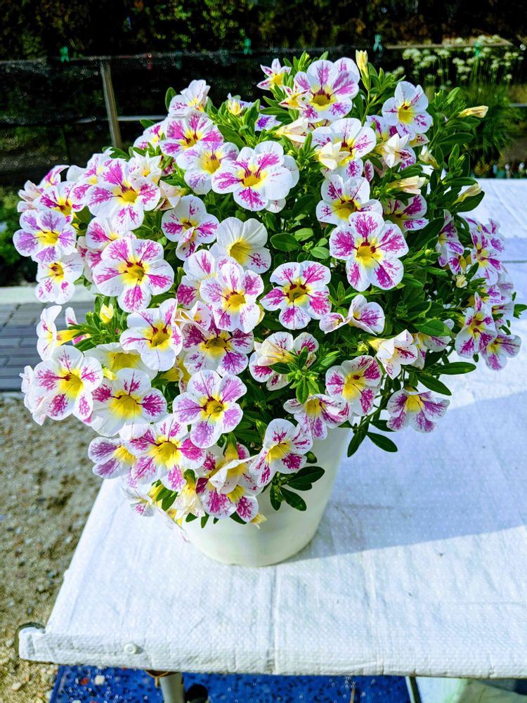 以前8/22に投稿した冬越8号鉢ホーリーカウちゃんから挿し芽した子供ちゃん😁6号鉢バージョンです。8号親株ちゃんが満開の頃、夏の暑さで模様が出ずほとんど白。切り戻して1ヶ月で満開になりました😄